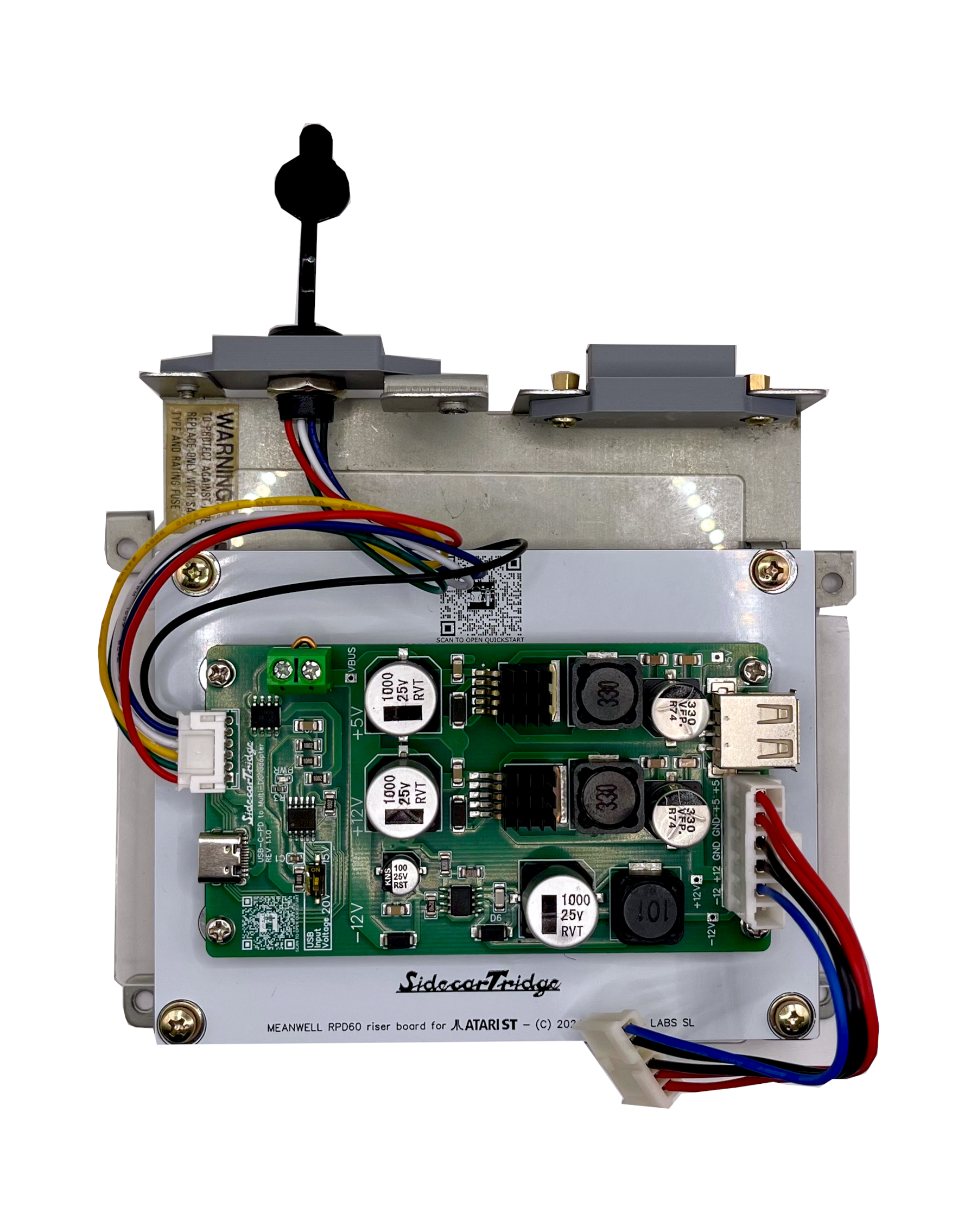 This kit runs on our SidecarTridge USB-C Power Delivery multi-rail converter. Bring a quality USB-C PD charger and the board will generate clean, regulated +5 V, +12 V, and −12 V inside the machine. It also provides a +5 V USB-A output to power internal devices like add-on boards or storage adapters. Only low-voltage DC lives inside for extra safety. It drops into the original PSU bay using a custom riser, plugs straight into the ST, STE, and MegaST connectors, and includes 3D-printed covers for the old AC inlet and PSU switch with a panel-mounted USB-C PD jack. Installation is solderless and quick, giving you a quiet, stable, well-protected supply that keeps your system happy for years.