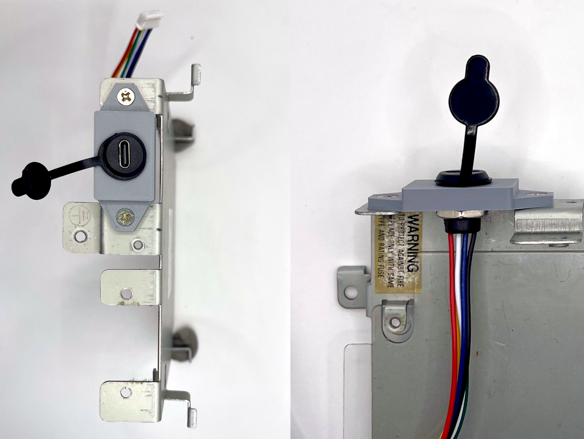 - 3D-printed replacement cover for the original AC inlet with a USB-C PD receptacle and JST-PH 2.0 terminated cable.