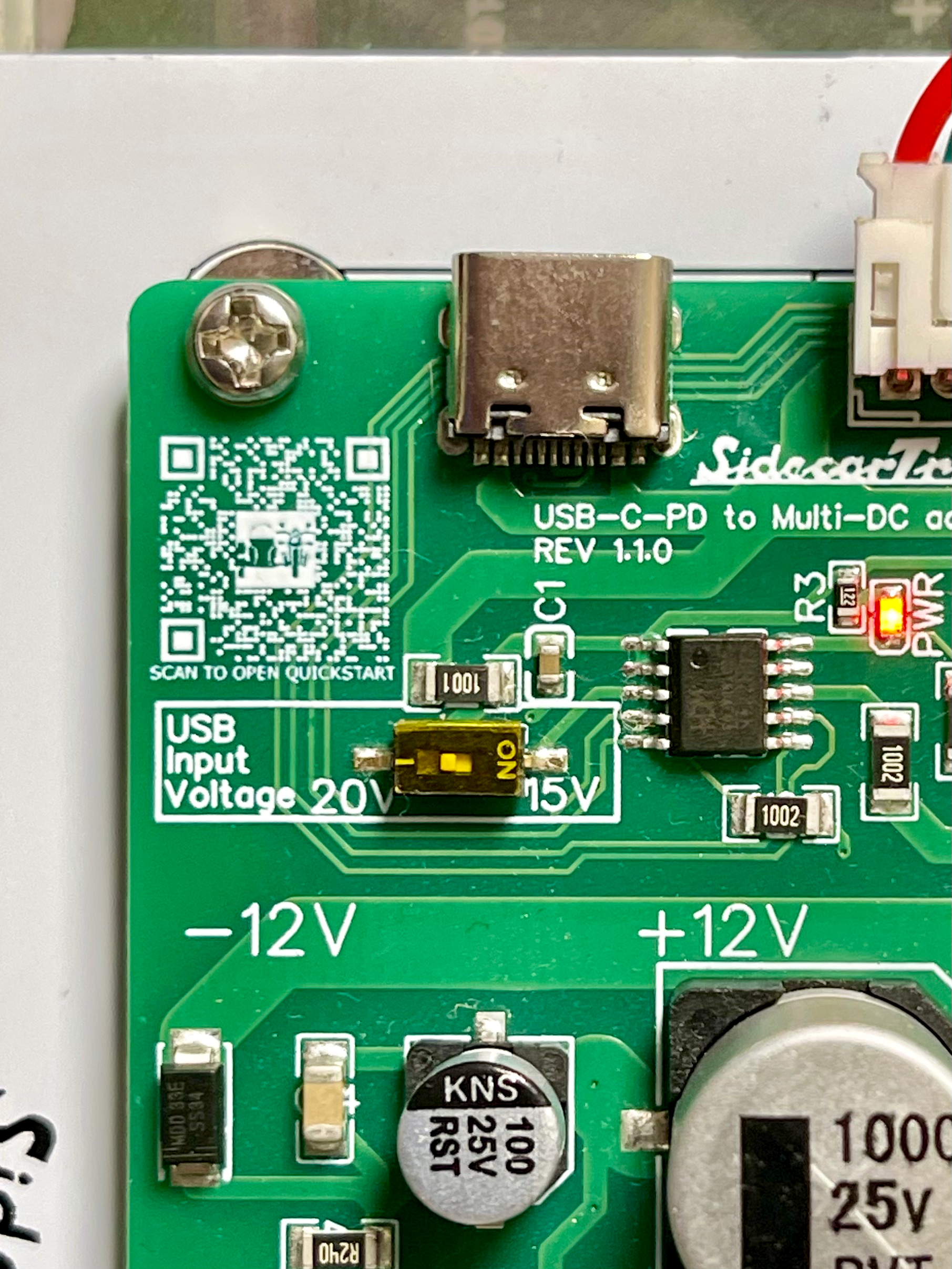 By default, the USB-C PD board is configured to request 20V from the power adapter. It is also possible to configure it to request 15V by changing the position of the small switch on the board: